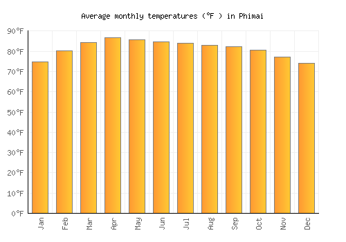 The bar chart below shows the average monthly peak daytime temperatures at Phimai