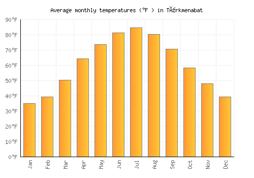 The bar chart below shows the average monthly peak daytime temperatures at Türkmenabat
