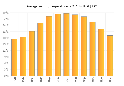The bar chart below shows the average monthly peak daytime temperatures at Phủ Lý