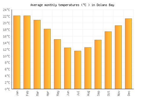 The bar chart below shows the average monthly peak daytime temperatures at Dolans Bay