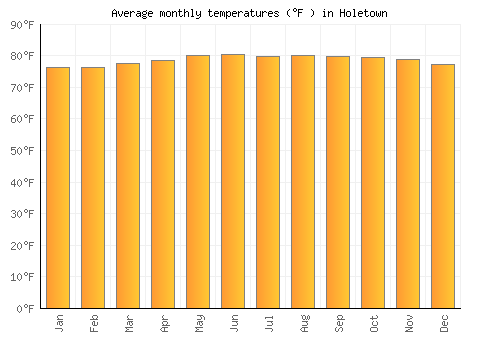 | Max °F | 76.3 | 76.3 | 77.4 | 78.6 | 80.1 | 80.4 | 79.9 | 80.1 | 79.9 | 79.3 | 78.8 | 77.2 |
