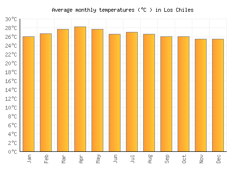 The bar chart below shows the average monthly peak daytime temperatures at Los Chiles