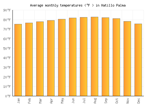 | Max °F | 75.4 | 76.5 | 77.9 | 79.2 | 80.6 | 81.9 | 82.6 | 82.8 | 82.2 | 81.1 | 78.3 | 75.7 |