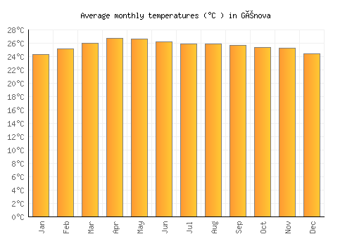 The bar chart below shows the average monthly peak daytime temperatures at Génova