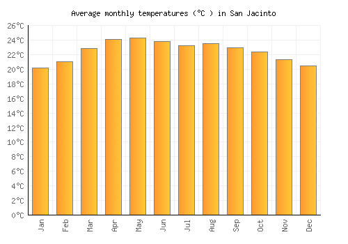The bar chart below shows the average monthly peak daytime temperatures at San Jacinto