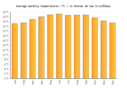 The bar chart below shows the average monthly peak daytime temperatures at Atenas de San Cristóbal