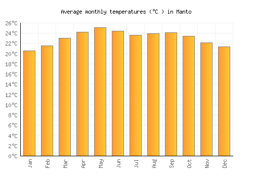 The bar chart below shows the average monthly peak daytime temperatures at Manto