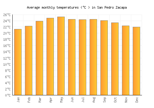 The bar chart below shows the average monthly peak daytime temperatures at San Pedro Zacapa