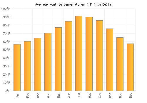The bar chart below shows the average monthly peak daytime temperatures at Delta