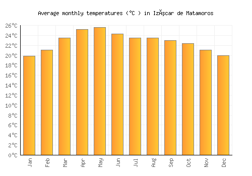 The bar chart below shows the average monthly peak daytime temperatures at Izúcar de Matamoros