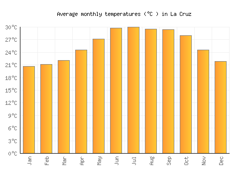 The bar chart below shows the average monthly peak daytime temperatures at La Cruz