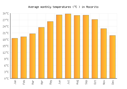 The bar chart below shows the average monthly peak daytime temperatures at Mocorito
