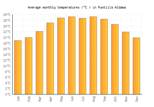 The bar chart below shows the average monthly peak daytime temperatures at Puntilla Aldama