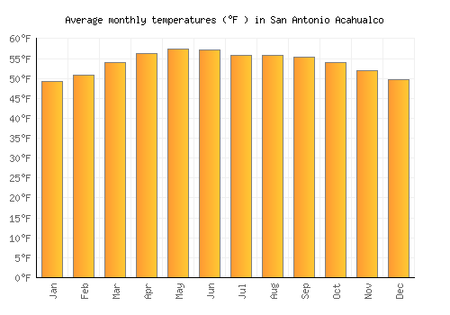 The bar chart below shows the average monthly peak daytime temperatures at San Antonio Acahualco