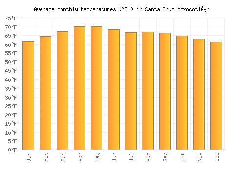 The bar chart below shows the average monthly peak daytime temperatures at Santa Cruz Xoxocotlán