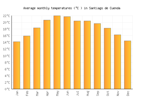 The bar chart below shows the average monthly peak daytime temperatures at Santiago de Cuenda