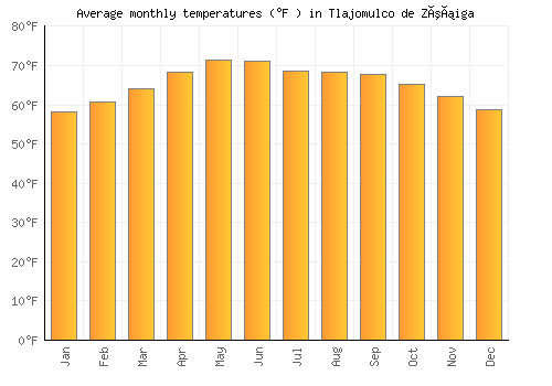 | Max °F | 58.1 | 60.6 | 64 | 68.4 | 71.4 | 71.1 | 68.5 | 68.2 | 67.8 | 65.3 | 62.1 | 58.8 |