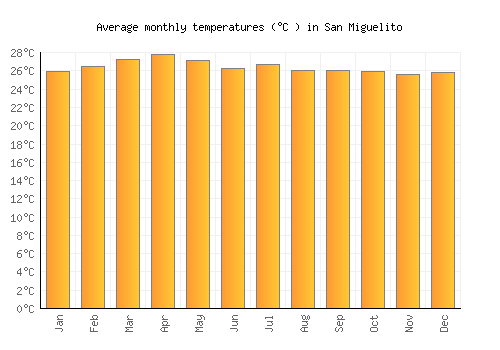 The bar chart below shows the average monthly peak daytime temperatures at San Miguelito