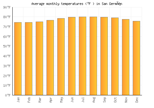 | Max °F | 74.3 | 74.5 | 75.2 | 76.6 | 78.4 | 79.7 | 80.1 | 80.1 | 79.9 | 79.3 | 77.7 | 75.7 |