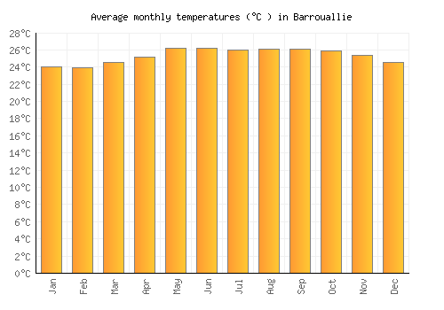 The bar chart below shows the average monthly peak daytime temperatures at Barrouallie