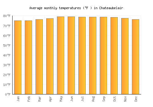 | Max °F | 75.2 | 75 | 76.3 | 77.4 | 79.2 | 79.2 | 78.8 | 79 | 79 | 78.6 | 77.7 | 76.3 |