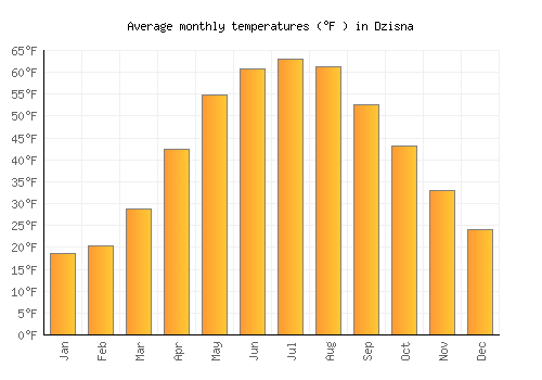 The bar chart below shows the average monthly peak daytime temperatures at Dzisna