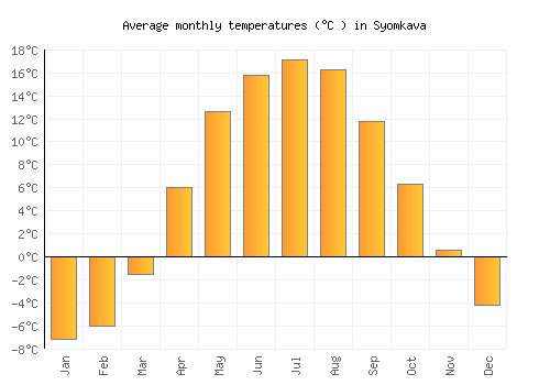 The bar chart below shows the average monthly peak daytime temperatures at Syomkava