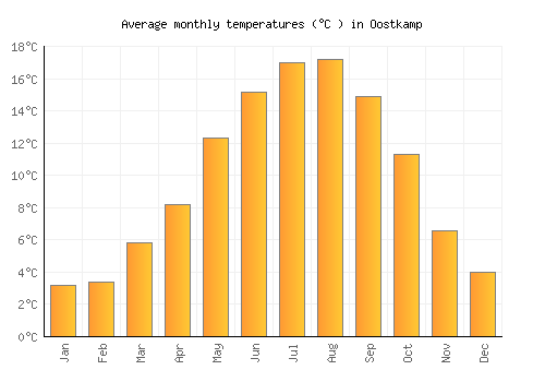The bar chart below shows the average monthly peak daytime temperatures at Oostkamp