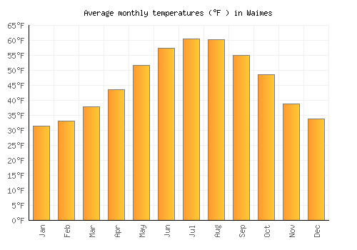 The bar chart below shows the average monthly peak daytime temperatures at Waimes