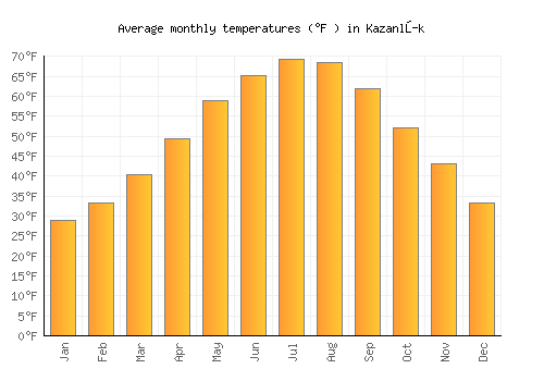 The bar chart below shows the average monthly peak daytime temperatures at Kazanlŭk