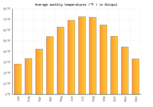 The bar chart below shows the average monthly peak daytime temperatures at Nikopol