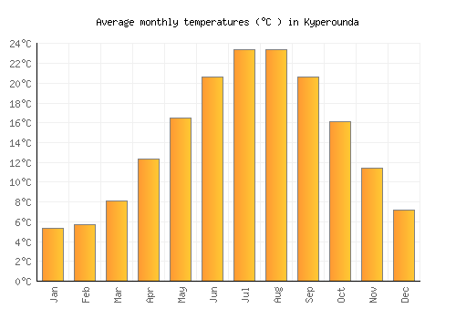 The bar chart below shows the average monthly peak daytime temperatures at Kyperounda