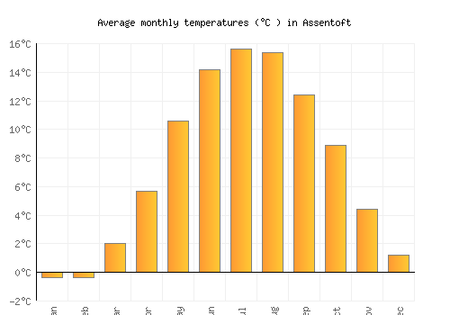 The bar chart below shows the average monthly peak daytime temperatures at Assentoft