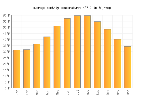 | Max °F | 31.6 | 31.8 | 36.1 | 42.4 | 51.1 | 57.4 | 59.7 | 59.7 | 54.7 | 48.4 | 40.3 | 34.3 |