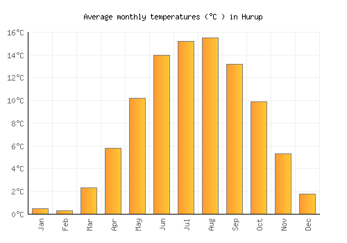 The bar chart below shows the average monthly peak daytime temperatures at Hurup