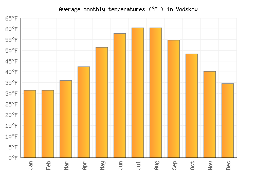 The bar chart below shows the average monthly peak daytime temperatures at Vodskov