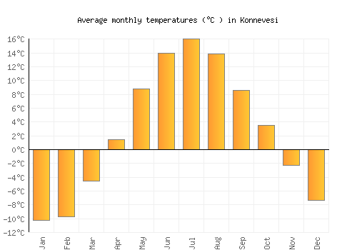 The bar chart below shows the average monthly peak daytime temperatures at Konnevesi