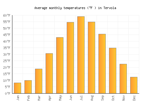 The bar chart below shows the average monthly peak daytime temperatures at Tervola