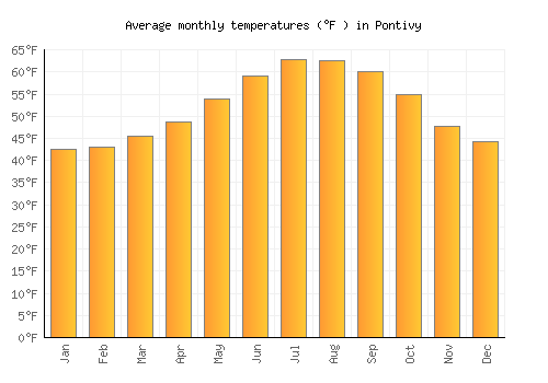 The bar chart below shows the average monthly peak daytime temperatures at Pontivy
