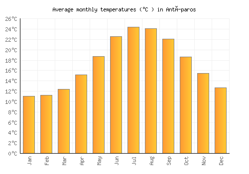The bar chart below shows the average monthly peak daytime temperatures at Antíparos