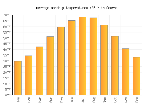 The bar chart below shows the average monthly peak daytime temperatures at Csorna