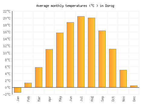 The bar chart below shows the average monthly peak daytime temperatures at Dorog