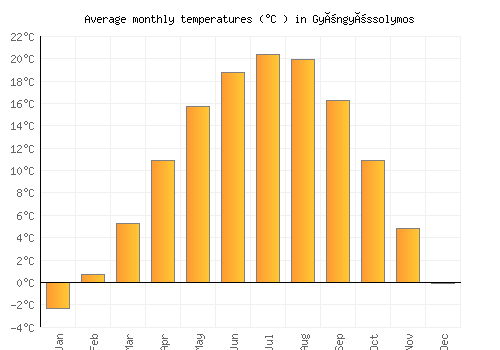 The bar chart below shows the average monthly peak daytime temperatures at Gyöngyössolymos