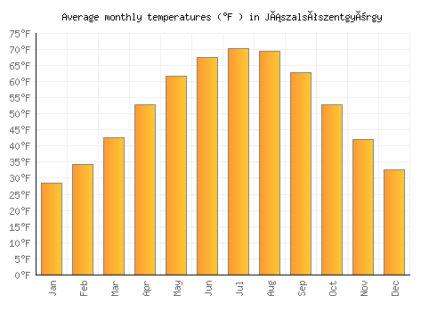 The bar chart below shows the average monthly peak daytime temperatures at Jászalsószentgyörgy