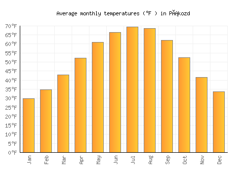The bar chart below shows the average monthly peak daytime temperatures at Pákozd