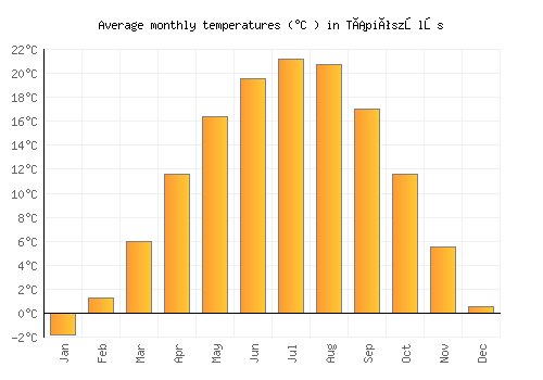The bar chart below shows the average monthly peak daytime temperatures at Tápiószőlős