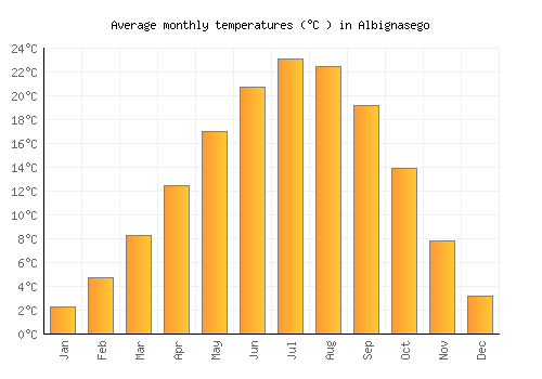 The bar chart below shows the average monthly peak daytime temperatures at Albignasego