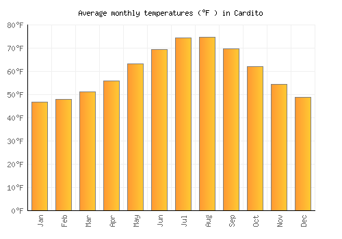 The bar chart below shows the average monthly peak daytime temperatures at Cardito