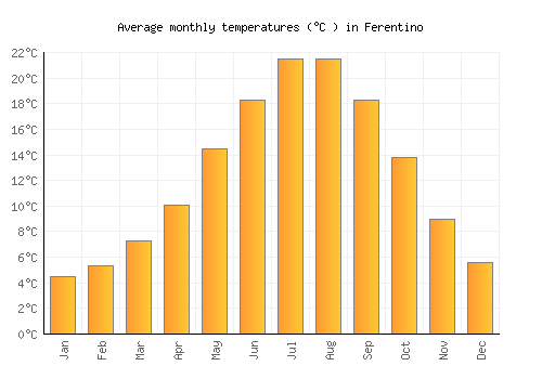 The bar chart below shows the average monthly peak daytime temperatures at Ferentino