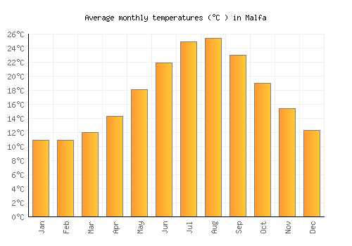 The bar chart below shows the average monthly peak daytime temperatures at Malfa